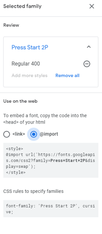 Clicking it should pop up a sidebar with installation instructions. Under "Use on the web" select the "@import" button. You should see code that looks something like: